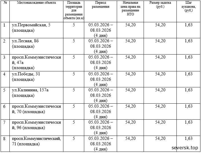 Аукцион на право размещения нестационарного торгового объекта для сезонной торговли, в том числе торговлей продукцией цветоводства на территории ЗАТО Северск во время празднования международного женского дня состоится 20.02.2026 года.